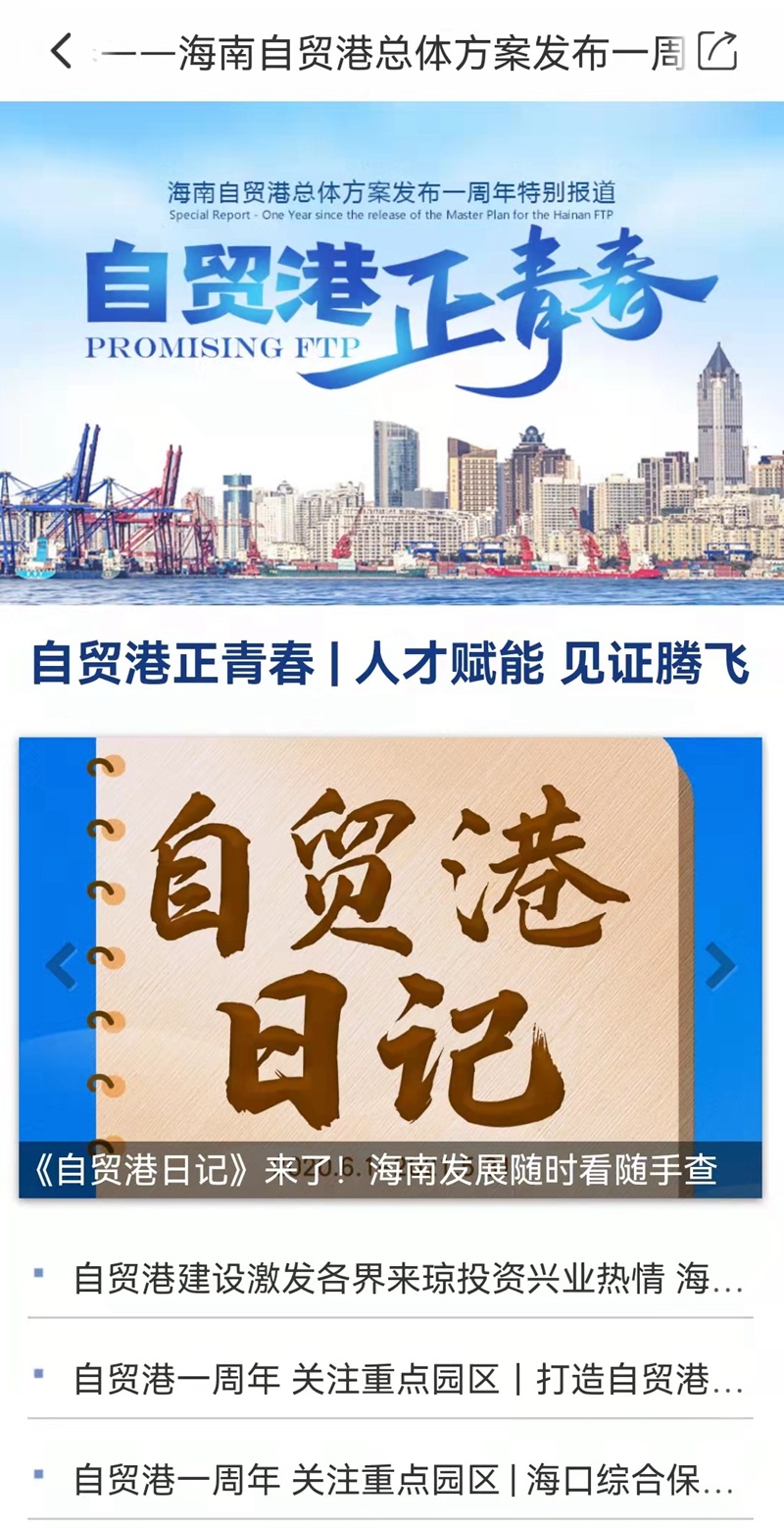 同时,特别推出融媒体产品《自贸港日记》,以日记形式记录自贸港建设的奋斗历程,产品还融入搜索功能,如同一本“电子口袋书”,方便网友随身携带查阅。打造《新海南思想荟》《慧说财经》等精品栏目,为读者带去有价值的自贸港信息。截至目前,新海南客户端自贸港频道共计发布海南自贸港相关报道近3万篇,吸引过亿人次浏览阅读。