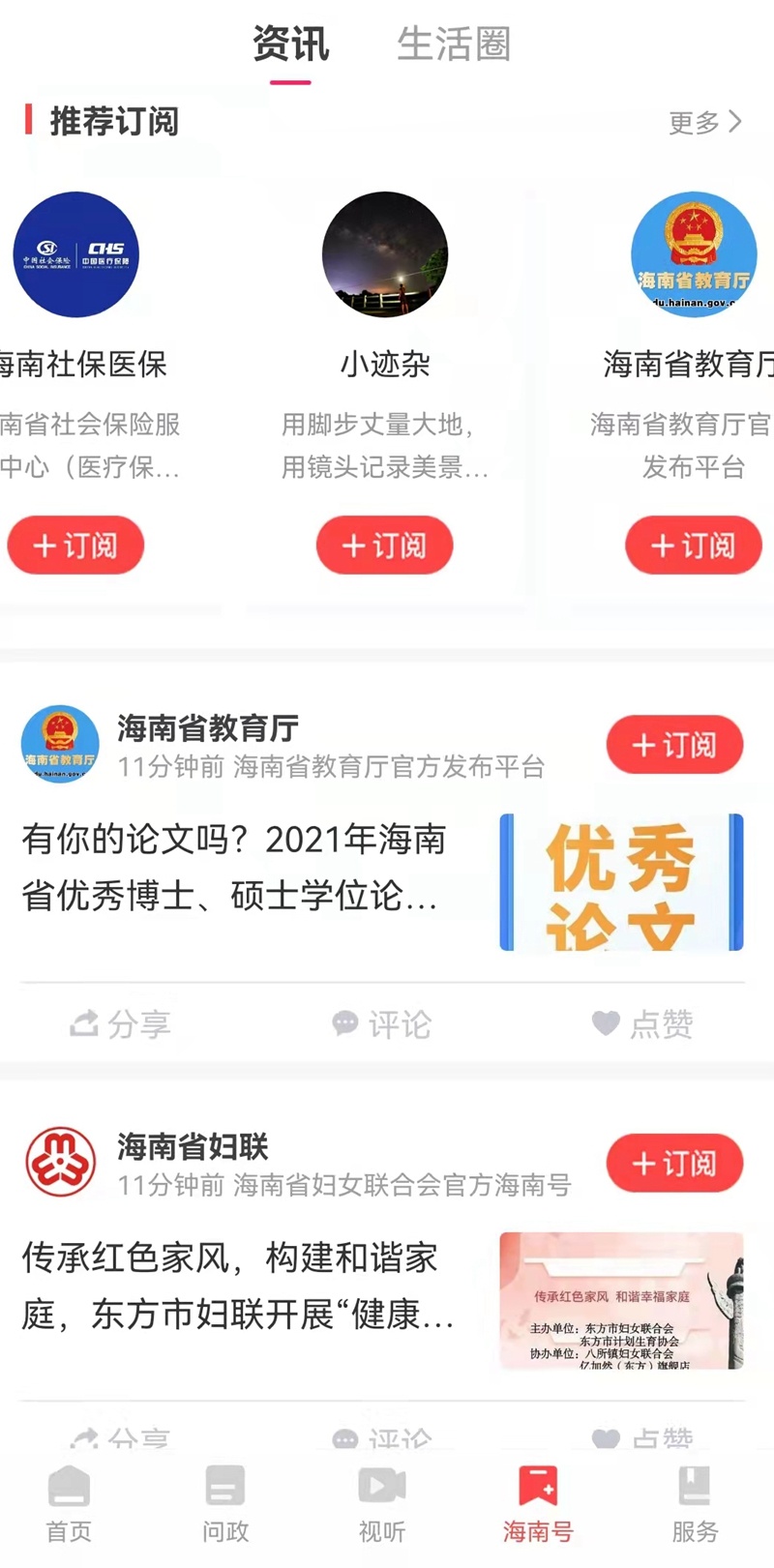 “海南号”是新海南客户端开设的星级栏目,致力于构建融媒体生态系统,打造海南最大的融媒体生态平台。“海南号”已实现用户自主入驻、自主订阅等相关服务,目前,海南号频道已入驻500+个账号,总订阅数43158个。
