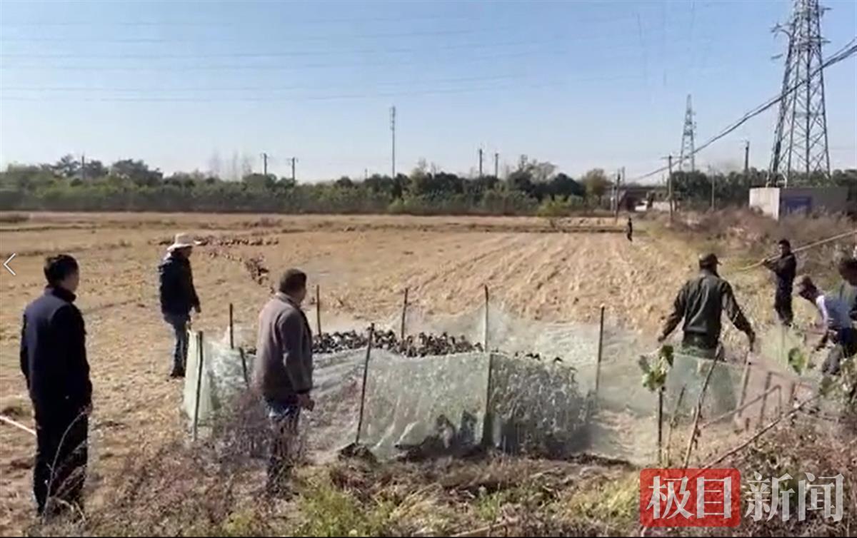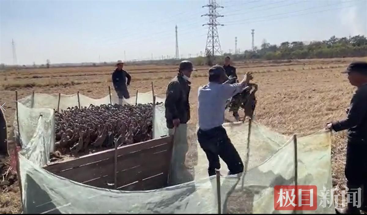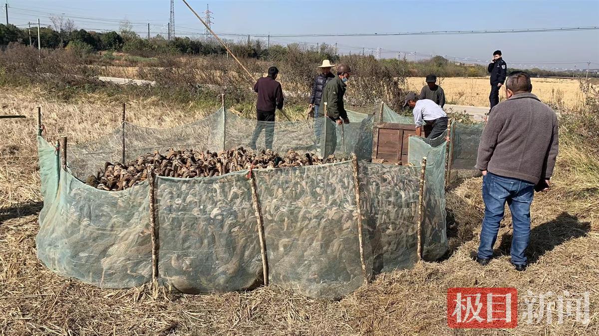 在民警的组织下,工人们先手持长竹竿把水塘里的鸭子赶到岸上,围在网圈里,然后五只为一组往圈外放。“5只、10只、15只……”袁权聚精会神地站在圈旁数着鸭子,任由响彻田野的鸭叫声和漫天飞舞的鸭绒将他包围。经过长达三个多小时的计数,民警终于数清了鸭子的数量:3812只!