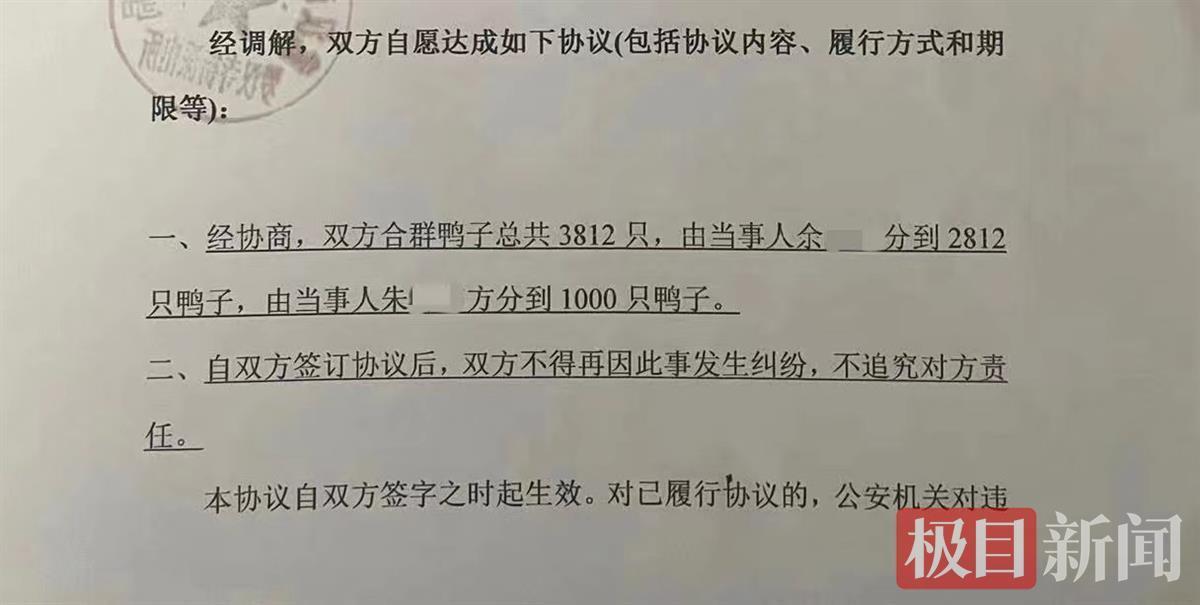双方对鸭子的总数都没有异议,但还是相互指责对方说假话、报假数。没办法,袁权等人对参与放养的工人和附近群众开展广泛走访,认真调查了双方鸭子的进货、运输、饲养情况,同时通知双方村干部和亲属到场共同协商。在民警的努力下,朱先生和余先生最终达成了调解协议:朱先生分得1000只鸭子,余先生分得2812只鸭子。