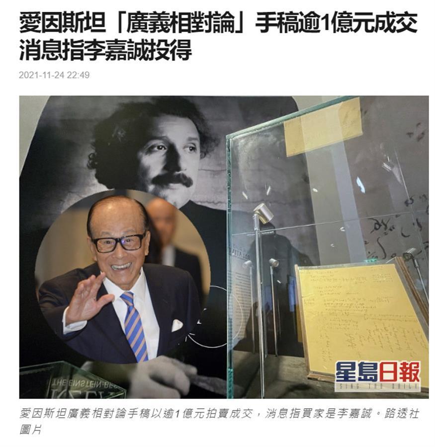 据《星岛日报》等多家媒体24日报道,日前,爱因斯坦的一份罕见手稿在法国巴黎拍卖,最终以以1170万欧元(约合1317万美元)的价格成交,创下历史纪录。虽然佳士得拍卖行没有透露买家身份,但据港媒消息,买家是香港长和系资深顾问李嘉诚。