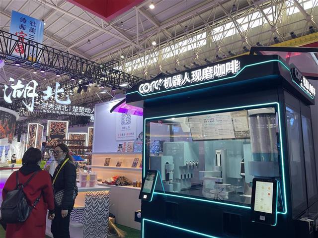 刚刚欣赏完湖北馆的“楚楚动人”,记者被一阵咖啡香味吸引,上海展厅中的无人咖啡亭正在制作现磨咖啡。上海展厅特别开辟出三分之一作为“咖啡馆”,供观众感受上海咖啡文化。现场工作人员唐雯倩介绍,本次展出的无人咖啡亭可以制作50多种不同口味的现磨咖啡。记者点击屏幕,即可选择包括卡布奇诺、拿铁、美式在内的多种咖啡种类,还可以定制甜度、温度,下单后,机器触手迅速开动,取杯、磨豆、萃取,不到一分钟,一杯现磨拿铁咖啡就送到了记者眼前。
