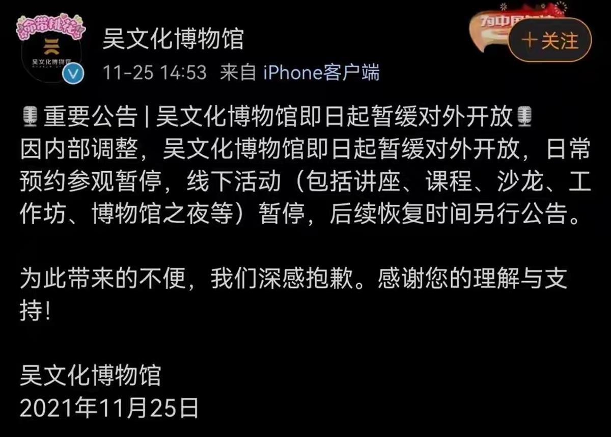 苏州多家文旅场所发布暂时关闭通知,包括甪直景区、西山景区、东山紫金庵景点、吴文化博物馆。苏州市甪直旅游发展有限公司发布闭园公告称,甪直景区自25日起实行闭园,停止景区内所有活动项目,恢复运营时间另行通知。苏州金庭旅游集团有限公司发布闭园公告称,西山景区自25日下午起实行闭园,停止景区内所有活动项目,恢复开放时间另行通知,已经购票的游客可以选择全额退款,或改期。紫金庵景点管理处发布闭园公告称,为保护文物及提升景区内综合景观,紫金庵于11月25日起进行闭园抢修工程,具体开园时间另行通知。据吴文化博物馆公告,因内部调整,吴文化博物馆即日起暂缓对外开放,日常预约参观暂停,线下活动(包括讲座、课程、沙龙、工作坊、博物馆之夜等)暂停,后续恢复时间另行公告。
