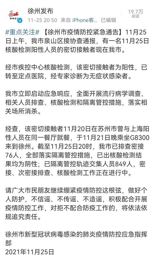 同时,极目新闻记者注意到,25日晚徐州发布官方微博发布消息称,11月25日上午,江苏徐州市泉山区接协查通报,有一名11月25日核酸检测阳性人员的密切接触者现在该市。经市疾控中心核酸检测,该密切接触者为阳性,已转至定点医院,经专家诊断为无症状感染者。经查,该密切接触者11月20日在苏州市曾与上海阳性人员在同一餐厅就餐,于11月21日晚乘坐G8300来到徐州。截至11月25日20时,该市已排查密接76人,全部落实隔离管控措施,已出核酸检测结果均为阴性;已隔离管控轨迹交集人员849人,密接、次密接排查、核酸检测工作正在进行中。