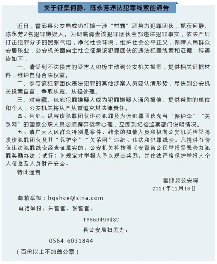 11月16日,安徽六安霍邱县公安局微信公众号发布一则征集违法犯罪线索的通告。通告称:霍邱县公安局近日成功打掉一涉“村霸”恶势力犯罪团伙,抓获何某、陈某2名犯罪嫌疑人。为彻底清查该犯罪团伙全部违法犯罪事实,公安机关面向全社会征集该犯罪团伙的违法犯罪线索和证据。