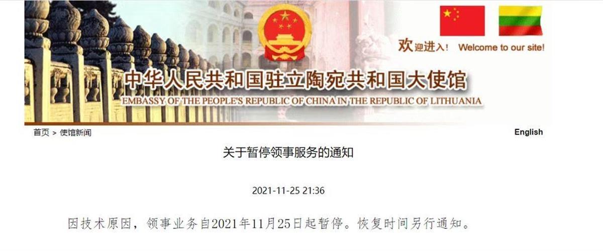 11月25日,中华人民共和国驻立陶宛共和国大使馆在其官方网站发布关于暂停领事服务的通知。通知称,因技术原因,领事业务自2021年11月25日起暂停。恢复时间另行通知。