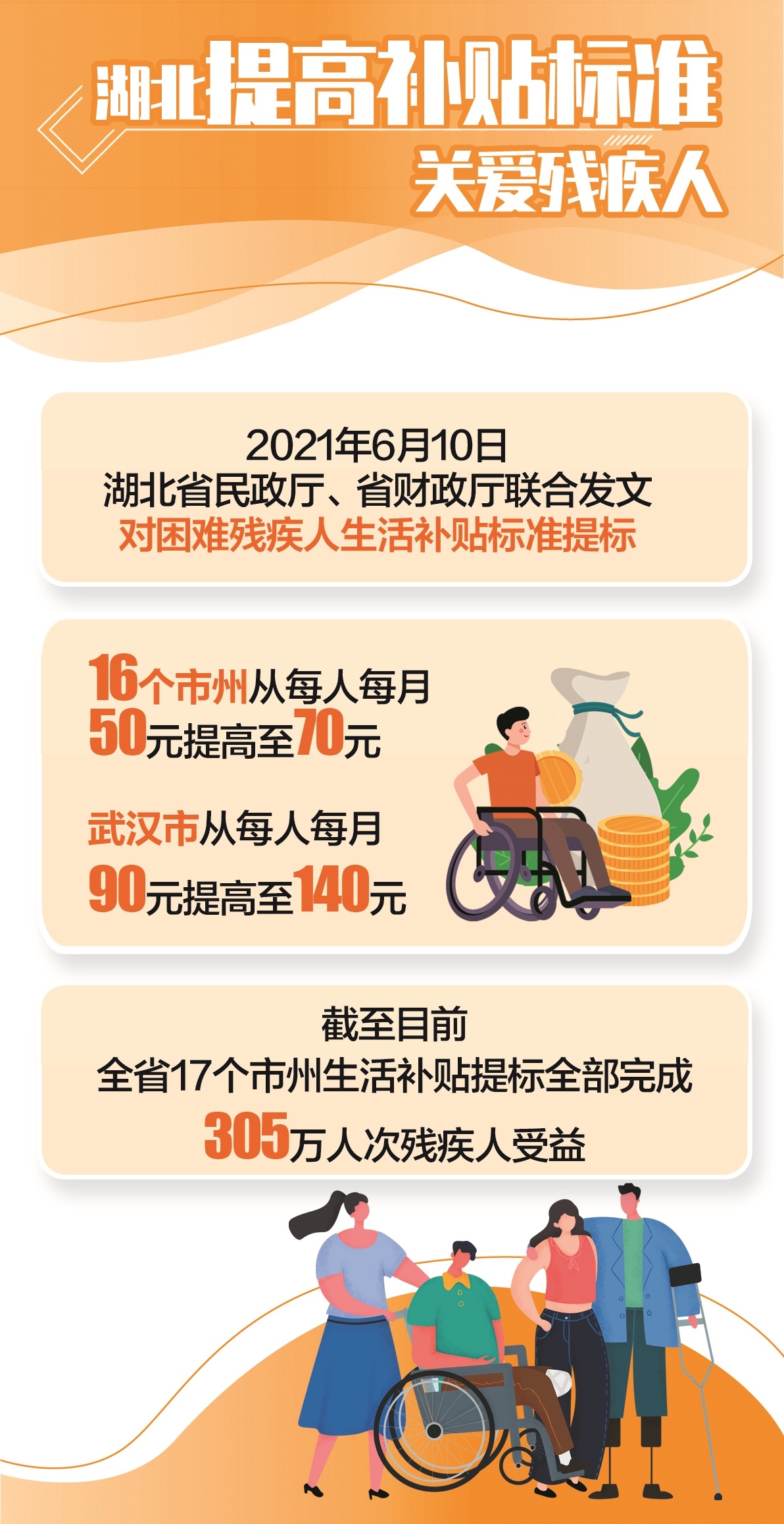 今年,湖北省委、省政府聚焦困难残疾人生活补贴提标和建立残疾两项补贴动态调整机制问题,将“关爱残疾人”项目纳入全省党史学习教育“十大惠民、四项关爱”实事项目。省民政厅、省财政厅联合下发《关于提高困难残疾人生活补贴标准的通知》。全省困难残疾人生活补贴标准由原每人每月50元提高至70元,自今年1月1日起计发。