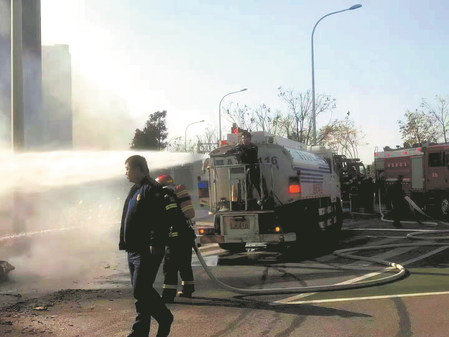 消防车撤离现场后,郭雨萌和张超安排6名环卫工人,将火灾现场残留的垃圾清理完毕,并将路面冲洗干净。