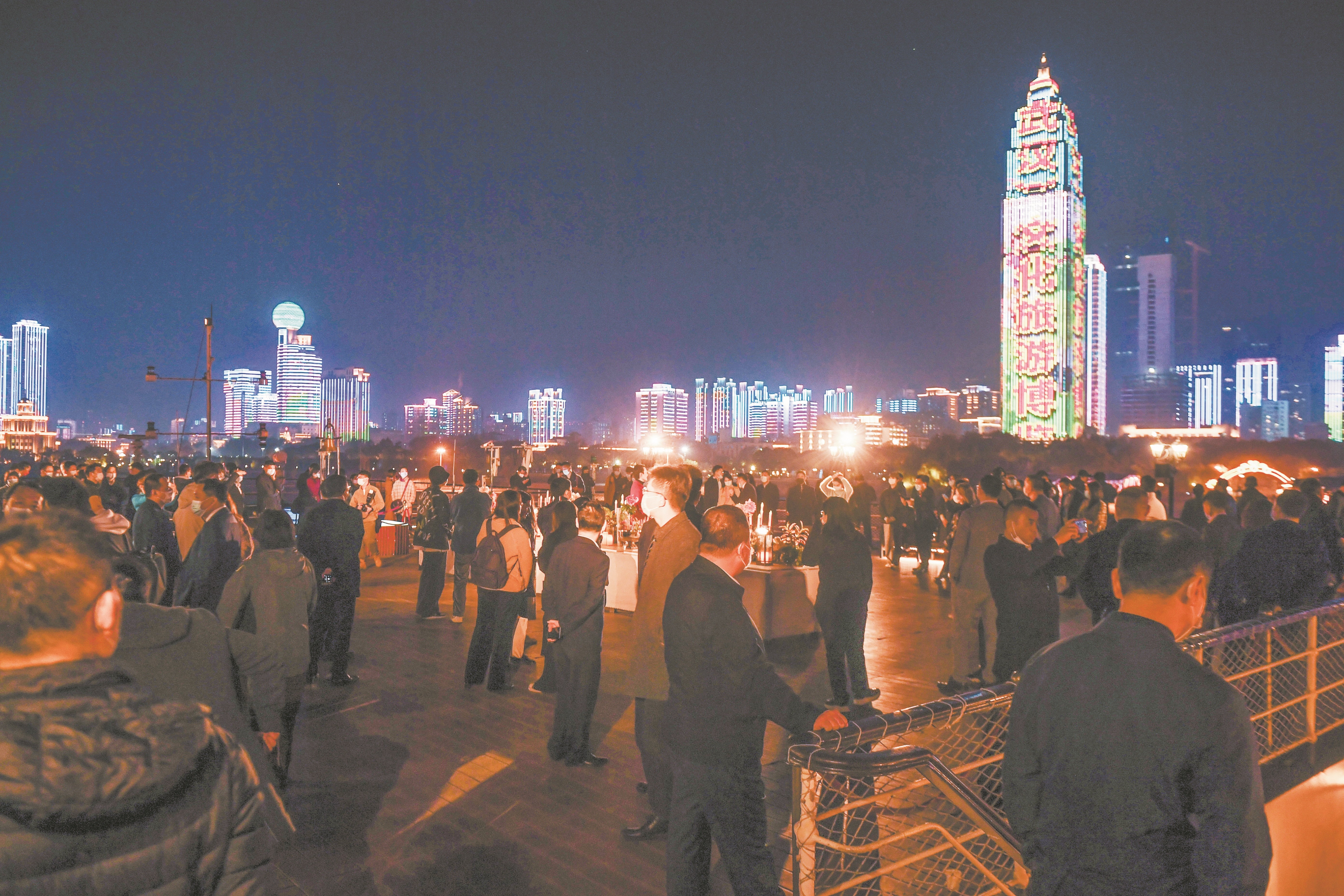 演出完毕。转至甲板上的嘉宾们连连赞叹。此时,以“美丽中国 美好生活”为题的长江灯光秀点亮两江四岸,光影讲述中国文旅之美。