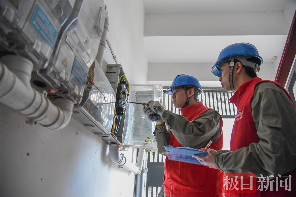 国网石首市供电公司桃花供电所电力工人在安置小区检修设备(极目新闻记者 黄志刚 摄)