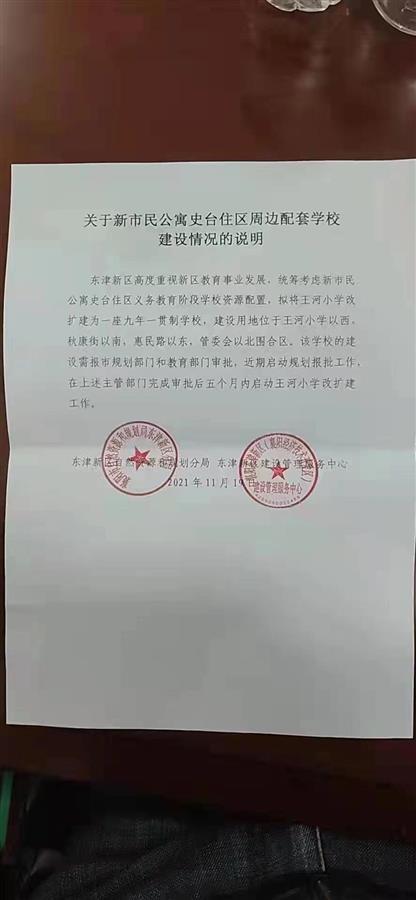 据一周姓业主介绍,11月19日,东津新区管委会领导组织规划局、住建局和教育局等相关部门就学校一事,召集业主召开了现场协调会。在这场会议上,决议通过了将王河小学改扩建为九年一贯制学校的升级方案,并承诺雅居乐业主在上报审批后五个月内启动学校建设。