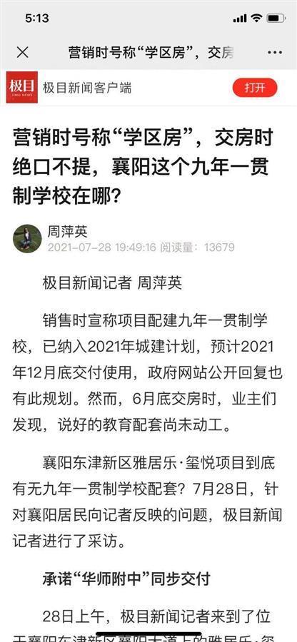营销时号称“学区房”,交房时却称“无规划”。2021年7月,极目新闻记者报道了襄阳东津新区雅居乐·玺悦楼盘业主的困境后,时隔4个月,业主告诉记者一个好消息:配套的学校有望在审批后5个月内启动建设。(极目新闻此前报道《营销时号称“学区房”,交房时绝口不提,襄阳这个九年一贯制学校在哪?》)