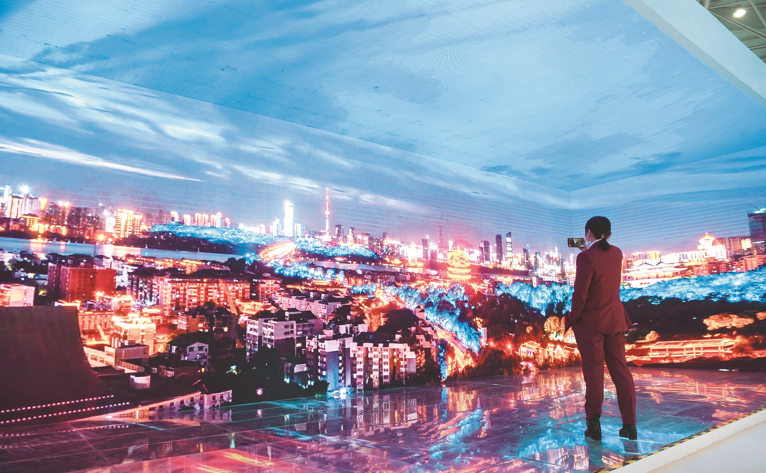 昨日,一名参观者在武汉展区观看全景视频 新华社发