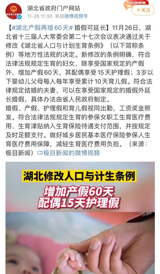 以湖北省为例,11月26日,湖北省十三届人大常委会第二十七次会议表决通过关于修改《湖北省人口与计划生育条例》等地方性法规的决定。