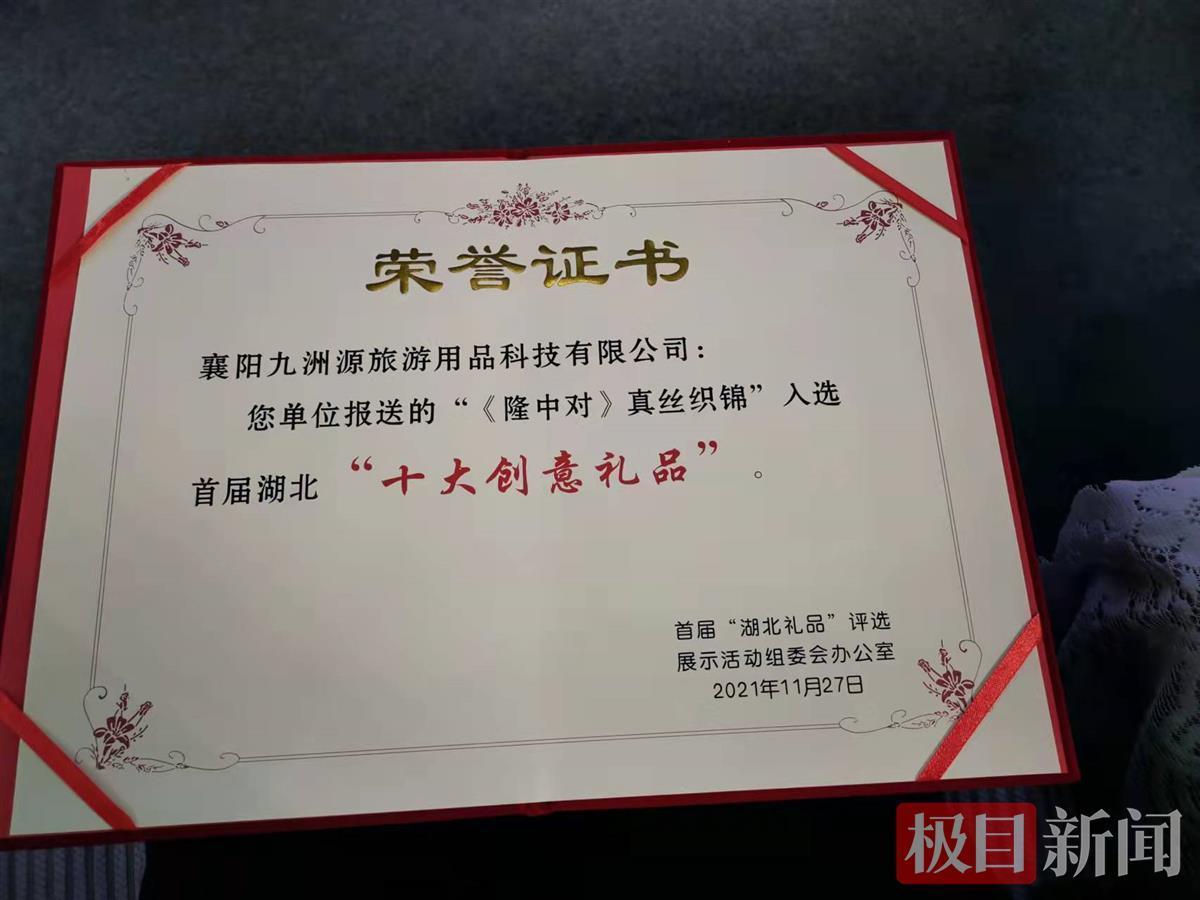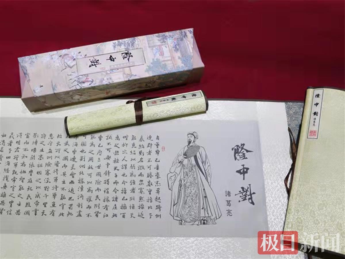 为了大力弘扬诸葛亮鞠躬尽瘁的赤诚之心,供八方来宾留作纪念,襄阳九洲源公司特邀请襄阳书法家钟耳书写《隆中对》全文,并以真丝锦绣,织成提花画卷。“我们运用了专利技术和世界先进的数码提花织造设备,结合传统的丝织技术,采用天然蚕丝为原料制造而成,是居家或场馆装饰、社会交往、外事活动、旅游纪念、亲友馈赠的极佳艺术精品。”该公司负责人刘时斌告诉极目新闻记者,“这次能当选‘湖北十大创意礼品’,我们觉得很荣幸,这既是大家对我们的肯定,也是一种挑战。下一步我们将扩宽销售渠道,将品牌做大做强,把知名度打出去。”