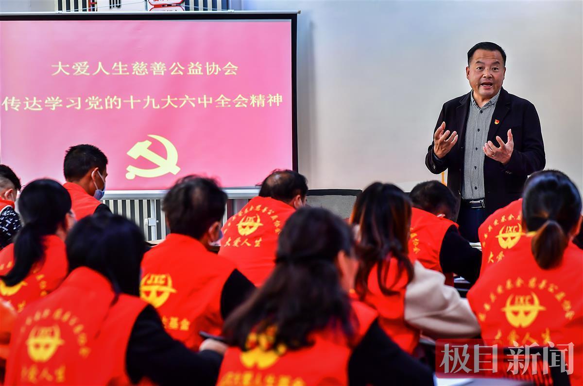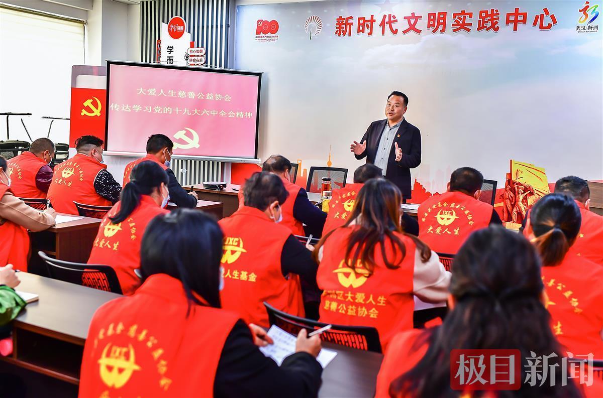在新洲区新时代文明实践中心,中国好人、“大爱人生”慈善志愿者协会发起人魏剑英,正在为志愿者们介绍新时代文明实践中心(所、站)在文明城市建设中发挥的作用,同时开展党的十九届六中全会宣讲培训。