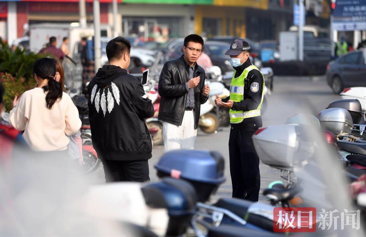 在新洲区邾城街摩尔城交通路口,新洲汉警快骑中队队员林逸凡,正在进行交通秩序整治网络直播,吸引了附近市民的关注。