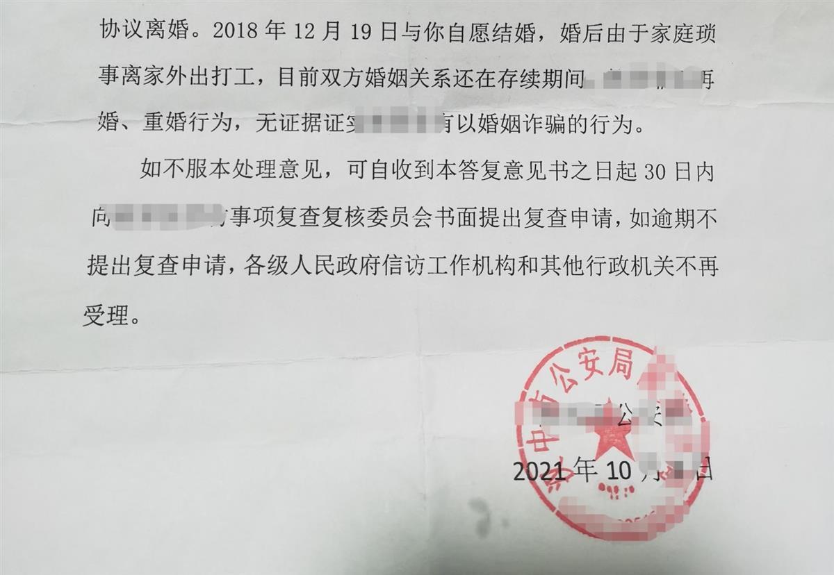 调查结果认为,陈登高和刘程程双方系自愿结婚,婚后由于家庭琐事,刘程程离家外出打工,目前双方婚姻关系还在存续期间,刘程程也没有再婚、重婚的行为,同时也没有证据证实刘程程有以婚姻诈骗的行为。