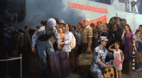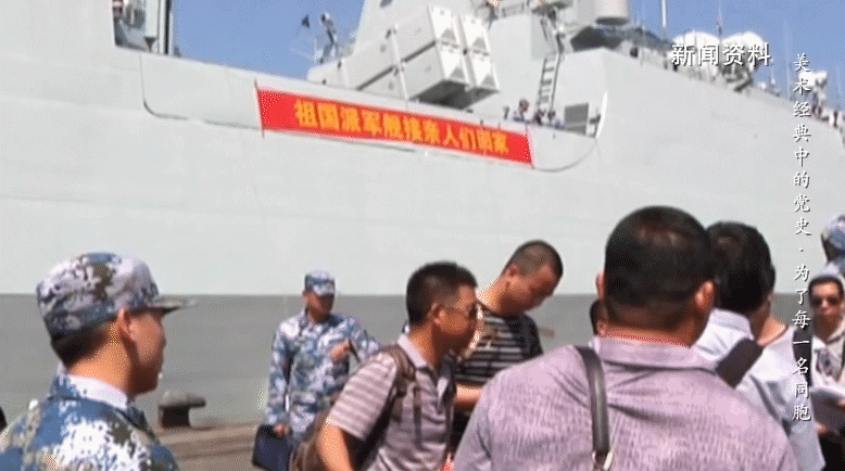 军舰上巨大的横幅“祖国派军舰接亲人们回家”让很多人热泪盈眶。