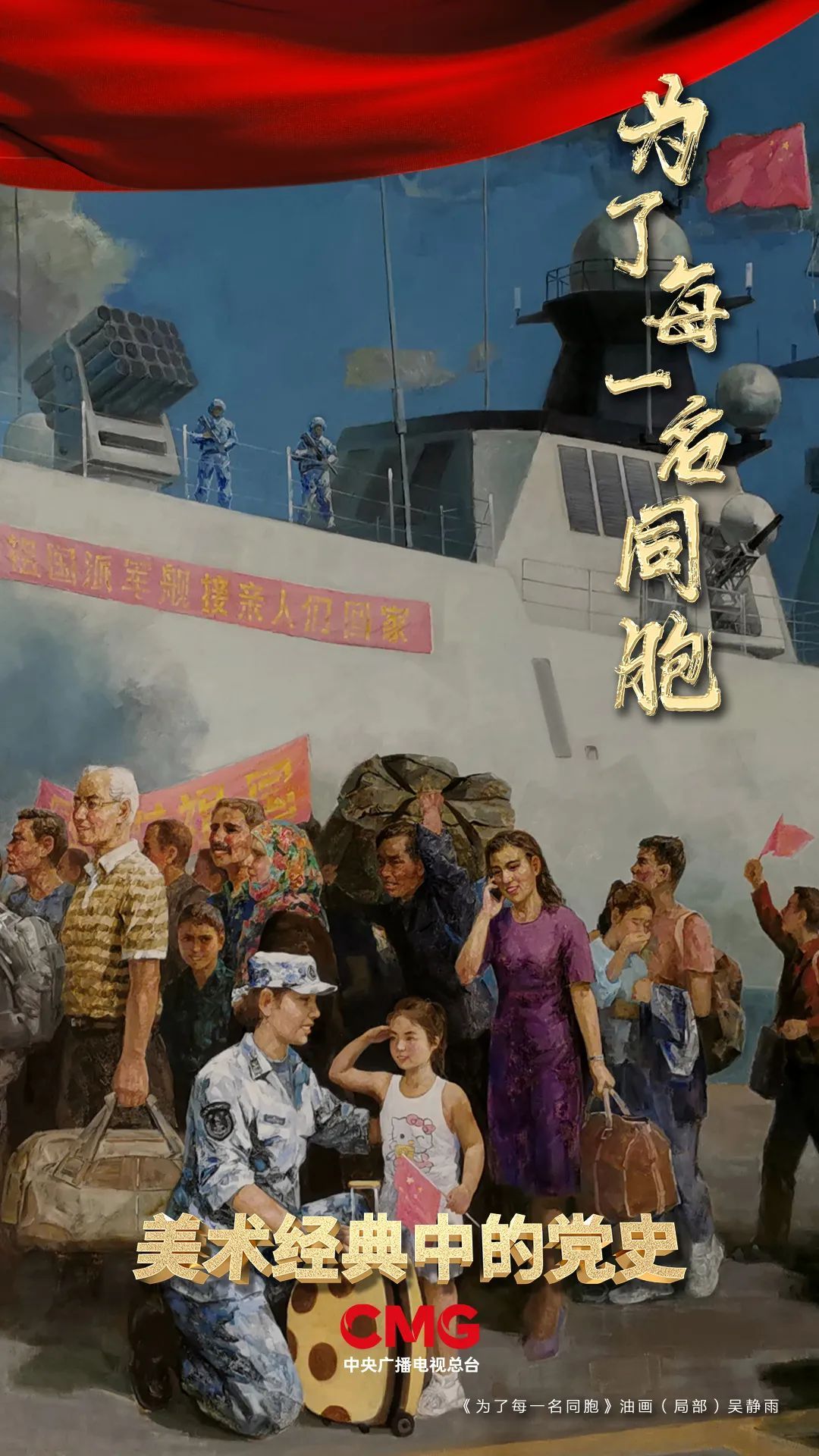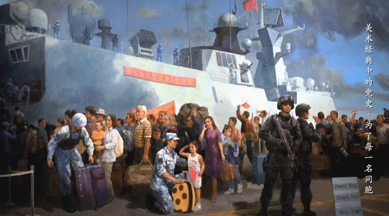 也门撤侨是一场坚定有力的国家行动,彰显了负责任大国的能力与担当。2021年,画家吴静雨根据这一事件创作了油画《为了每一名同胞》。