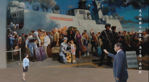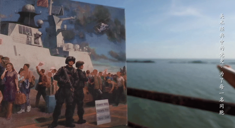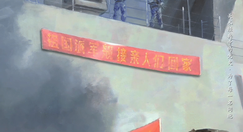 画作中,“祖国派军舰接亲人们回家”十一个大字格外醒目,给同胞们带来平安回家的希望,突出了画作的主题。