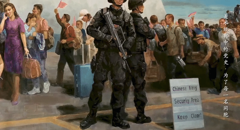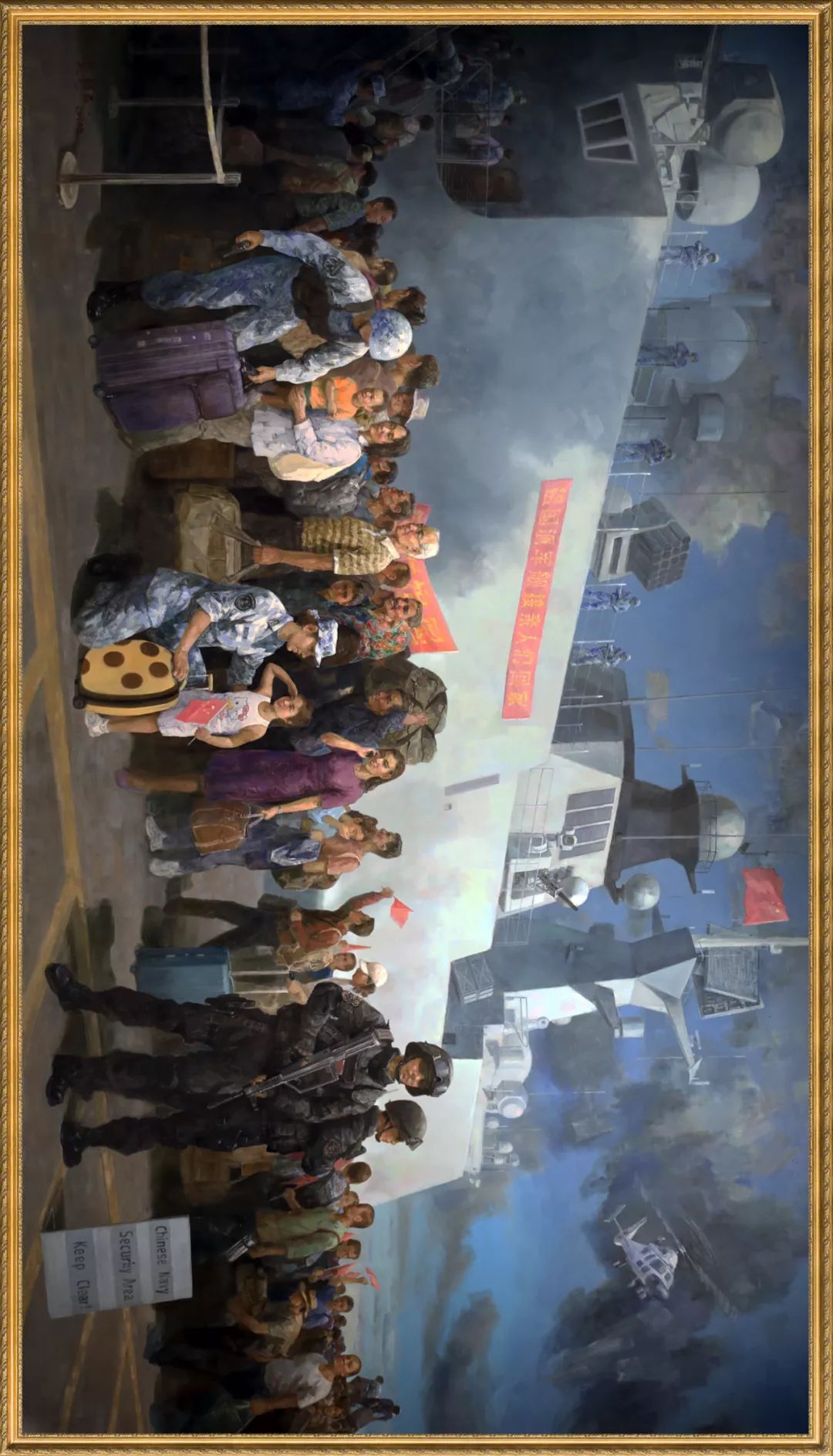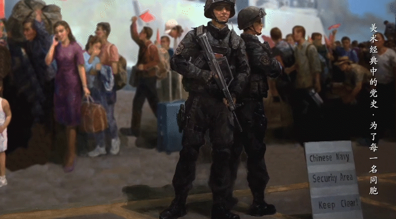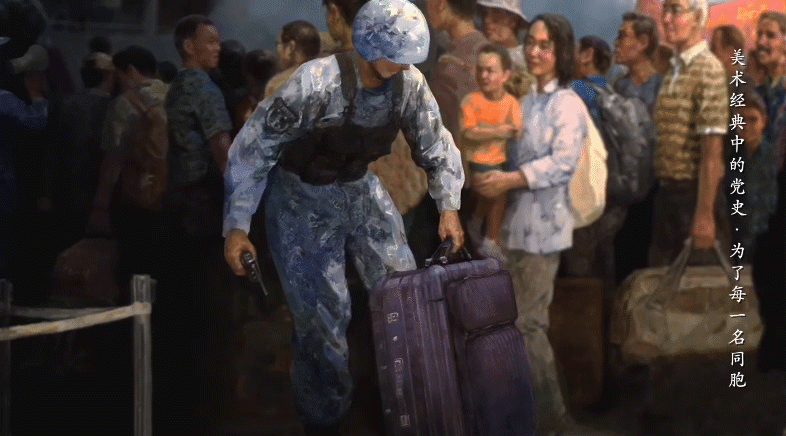 作品左边是一名正在帮侨民搬运行李箱的战士,右边是两个全副武装、威武挺拔的海军陆战队战士,他们装备精良,坚定而不可侵犯。整幅画作营造出紧张、高效、成功的撤侨场面。