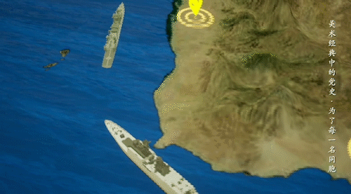 弥漫着硝烟的蓝色天空中一架舰载直升机在盘旋,营造出当时动荡不安的氛围。