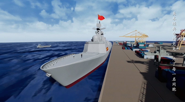 画家大胆地采用了人物和军舰各占一半的构图方式。护卫舰顶端,高扬的五星红旗与码头上的海军战士形成一个稳定的三角形构图。