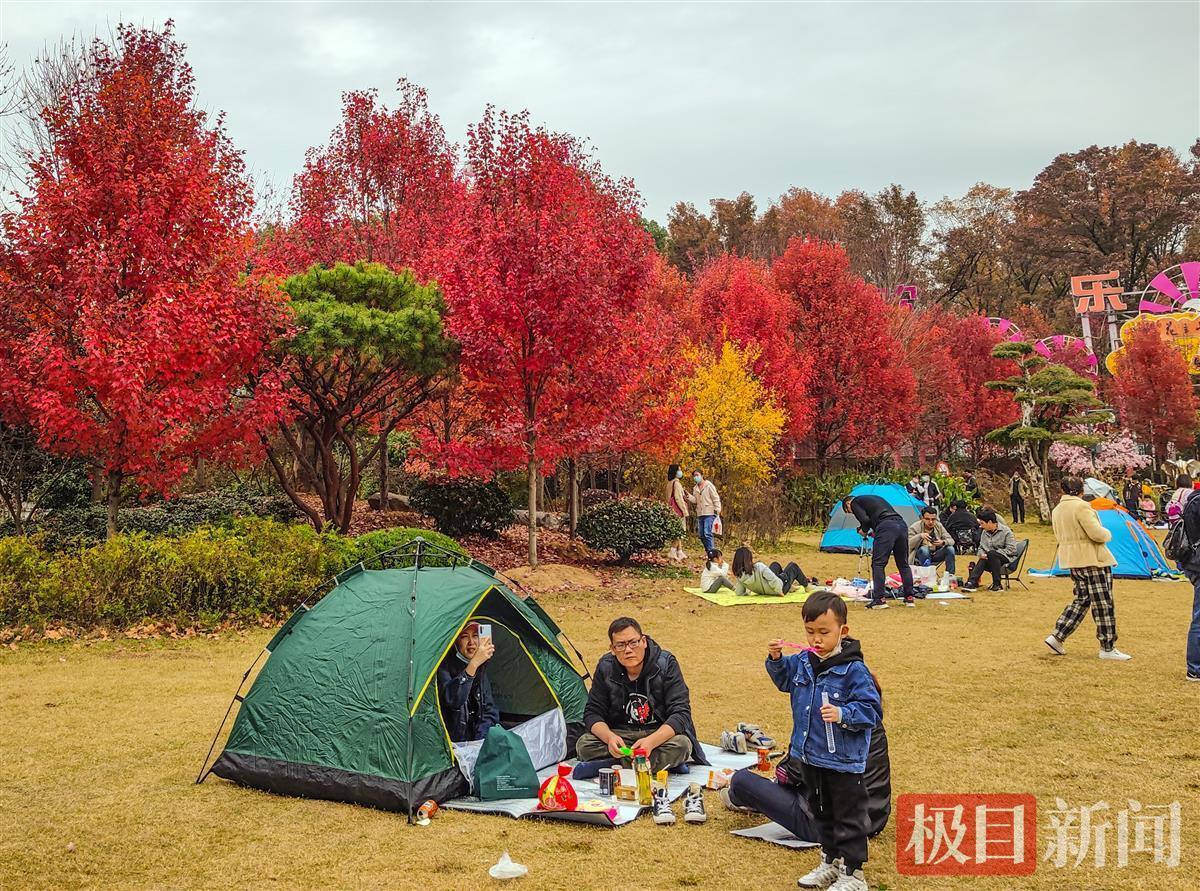 当天和风煦日,不少人被这片迷人风光陶醉,人们或深入枫林与枫叶亲密接触,或带着家人沉浸在这片艳丽的山色中。