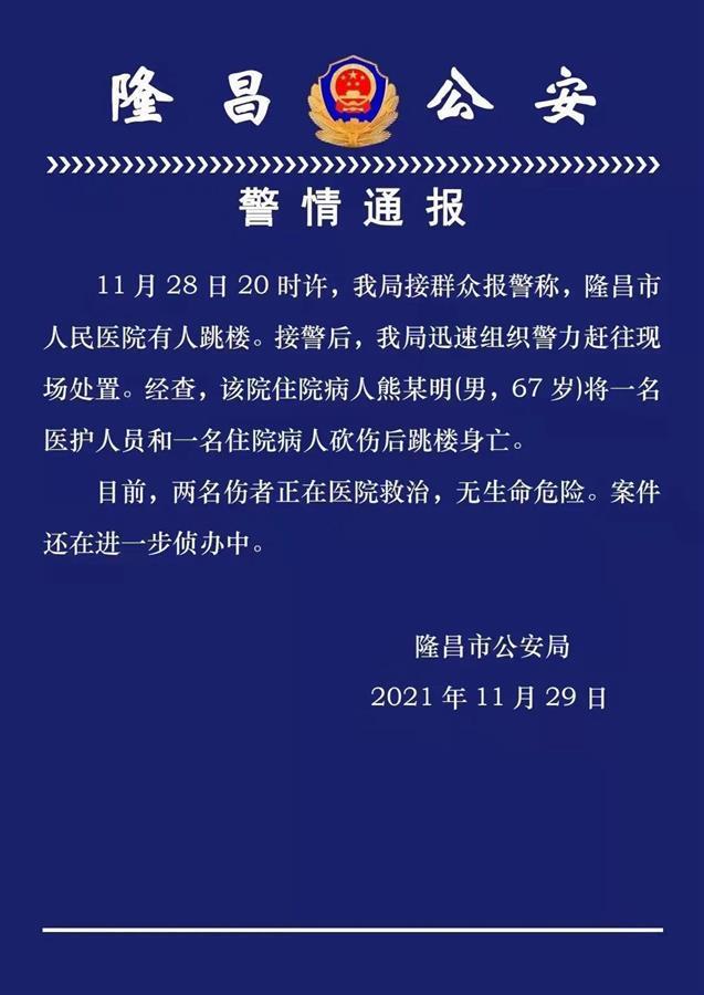 11月29日,四川省隆昌市公安局发布一起警情通报:11月28日20时许,公安局接群众报警称,隆昌市人民医院有人跳楼。接警后,公安局迅速组织警力赶往现场处置。经查,该院住院病人熊某明(男,67岁)将一名医护人员和一名住院病人砍伤后跳楼身亡。目前,两名伤者正在医院救治,无生命危险。案件还在进一步侦办中。极目新闻记者多方了解到,伤者系行凶者旁边病床的老人和一位护士。