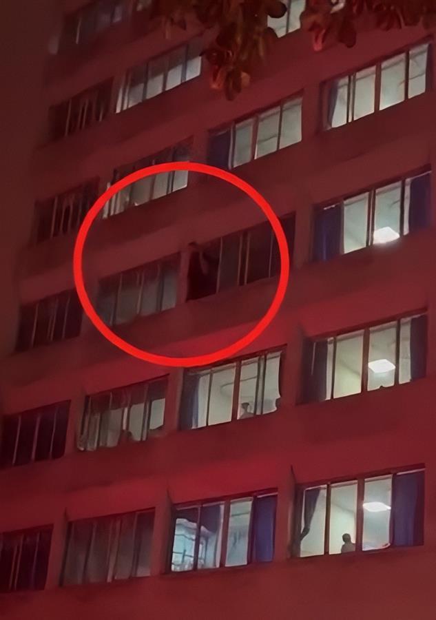 现场图片显示,一男子开着窗户站在房屋外向下观望,楼下聚集了很多消防员和警察。
