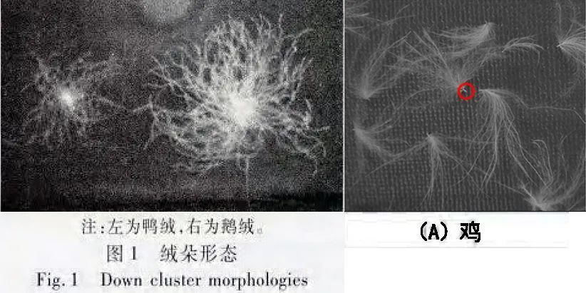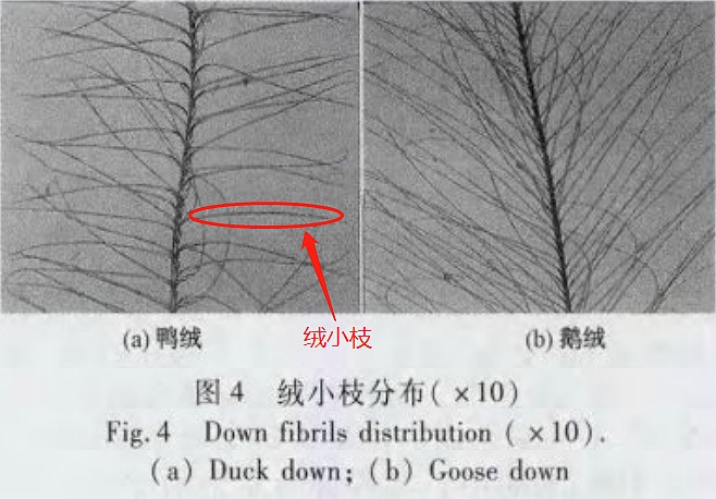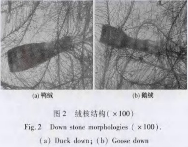 鸭绒和鹅绒虽然没有羽轴,却都有绒核。鸭绒的绒核(宽度0.1~0.5mm)较粗而硬,而鹅绒(绒核宽度在0.05~0.4mm)细软而干瘪。所以鸭绒中没有保暖功能的“废物”含量较高。