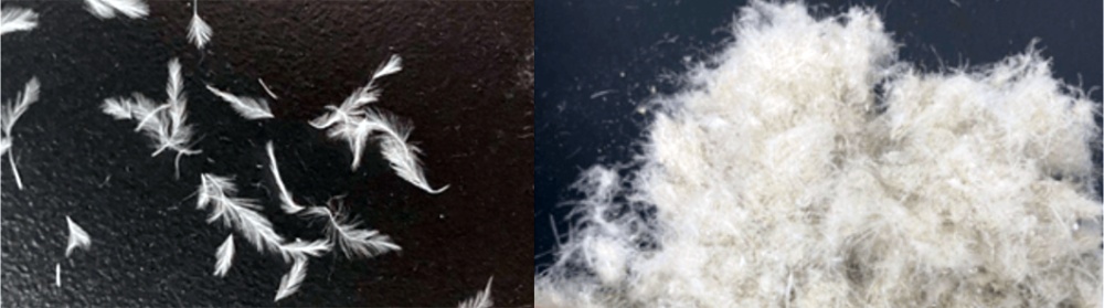 “鸡羽绒”单根(左)和处理好的“鸡羽绒”(右)