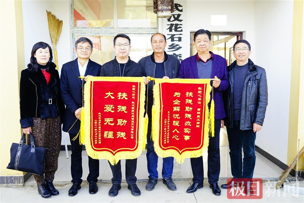 11月22日,在山水环绕的武汉花石乡恋生态农业有限公司门前,总经理陈腊平激动万分,他将印有“扶残助残办实事,为企解忧暖人心”和“扶残助残,大爱无疆”文字内容的锦旗分别送到了黄陂区工商联副主席钱光争和爱心企业武汉欧度优品管道卫浴有限公司负责人张慧的手中,“感谢工商联为残疾人企业排忧解难,让我们的日子过得越来越好。”