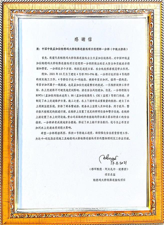 各建设工点均取得重大突破,受到各界一致好评和广泛赞誉,11月17日,孟国业主送来感谢信,对项目部付出的巨大努力和贡献,特别是安全环保、质量进度方面取得的成绩表达了感谢和赞赏。