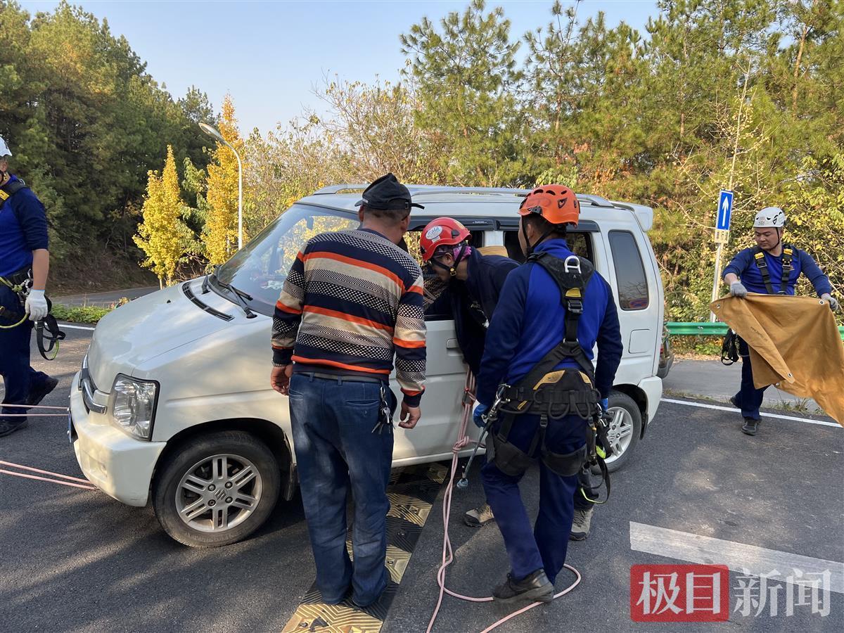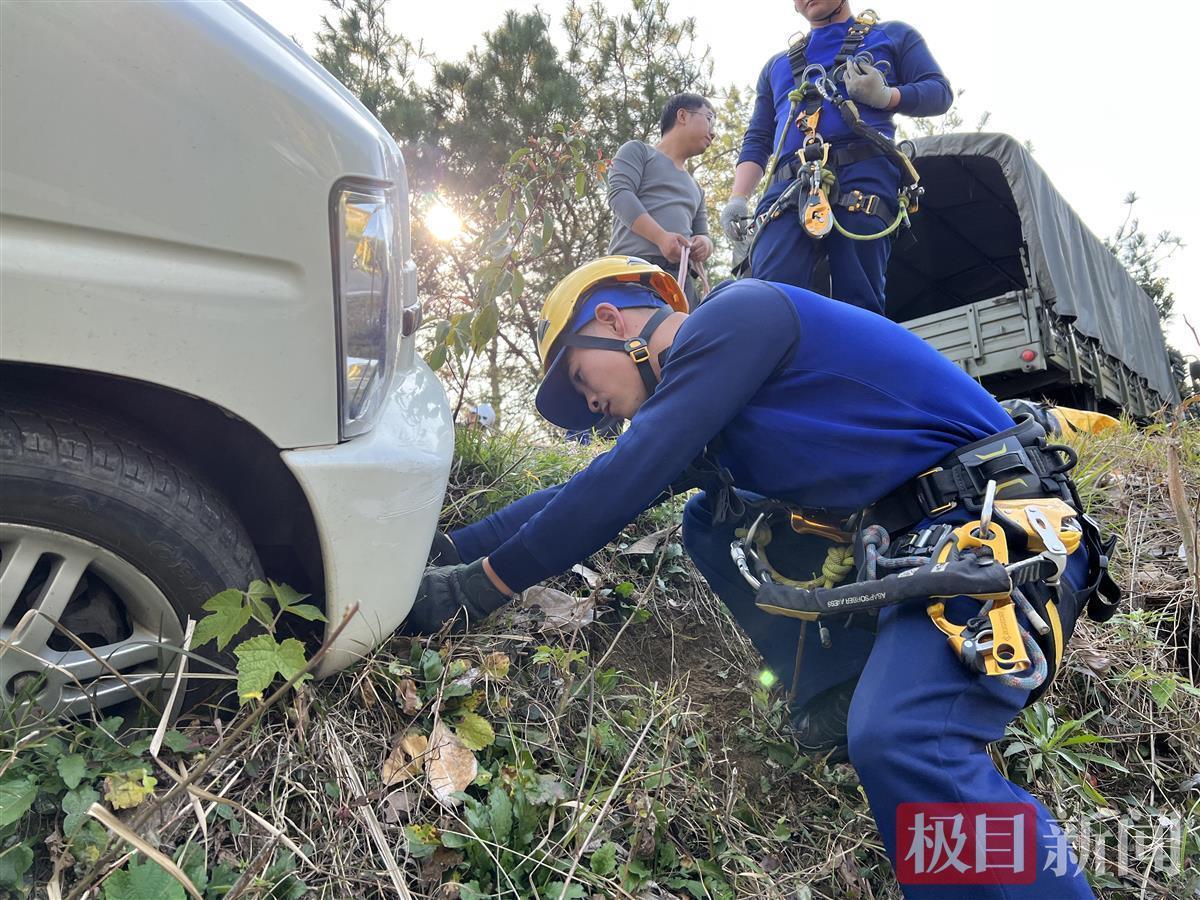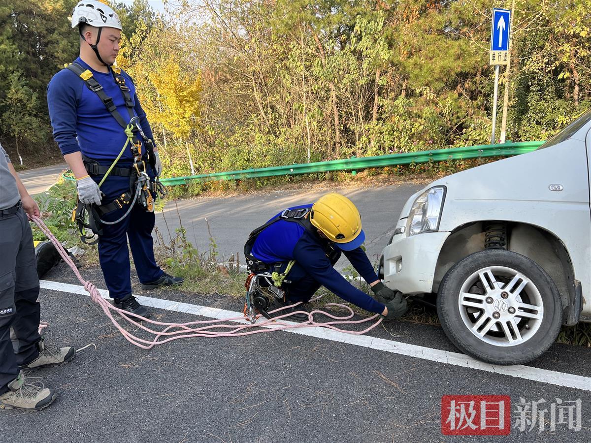 就在王先生一筹莫展时,他发现约200米远的道观河风景区龙凤桥附近有一群消防员正在训练,王先生迅速跑到训练点,向正在进行绳索专业训练的水域救援专业队求救:“我的车子滑到斜坡上,车里有人被困,请你们快去帮帮忙!”消防员听到情况后,立即集合赶到事发地。
