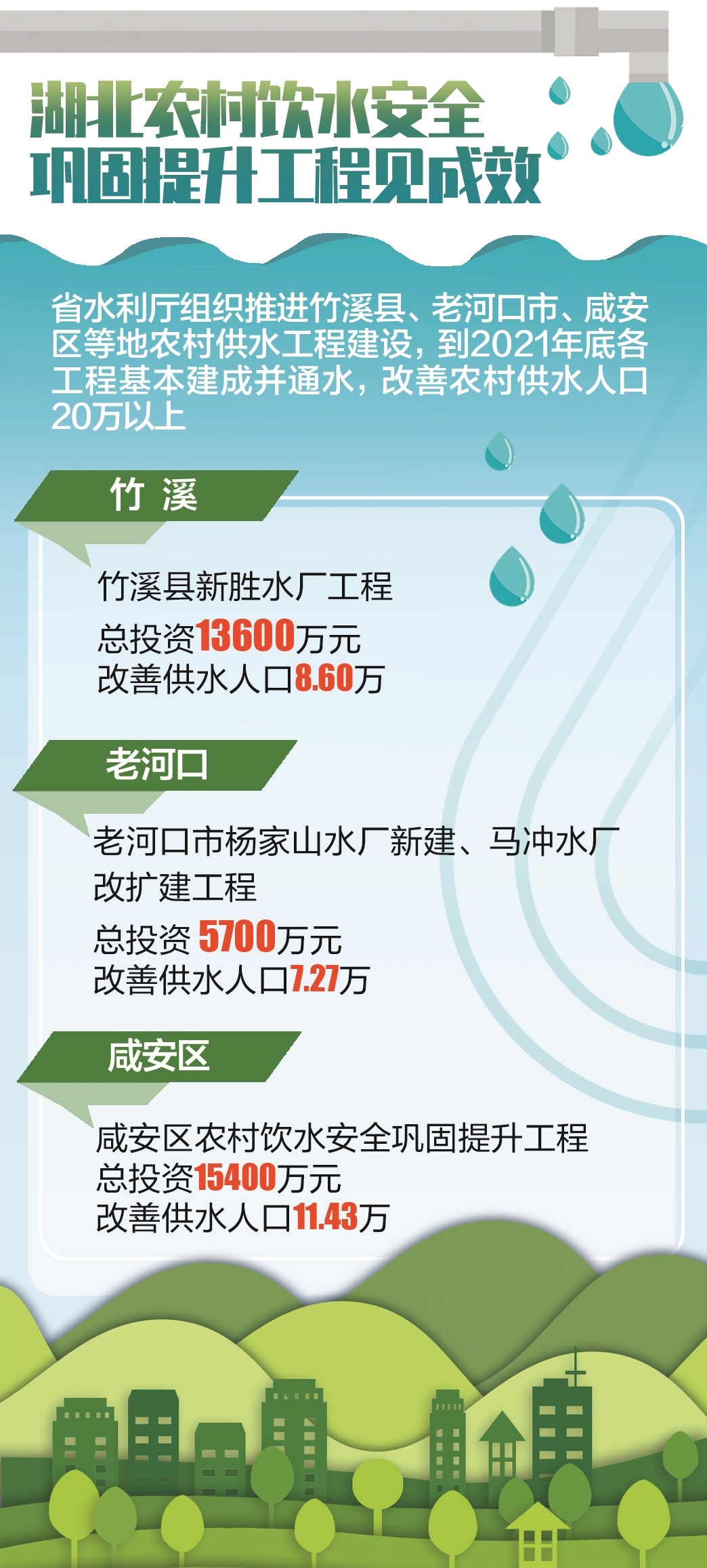 其中,实施农村饮水安全巩固提升工程是重点事项之一。湖北省水利厅有关人士介绍,按照水利部提出不断提升农村饮水标准,由农村饮水安全转变成农村供水保障为方向,省水利厅组织推进竹溪县、老河口市、咸安区等地补短板强功能农村供水工程建设,力争到2021年底各工程基本建成并通水,改善农村供水人口20万以上,让广大农村群众稳定持久喝上放心水、健康水、幸福水。