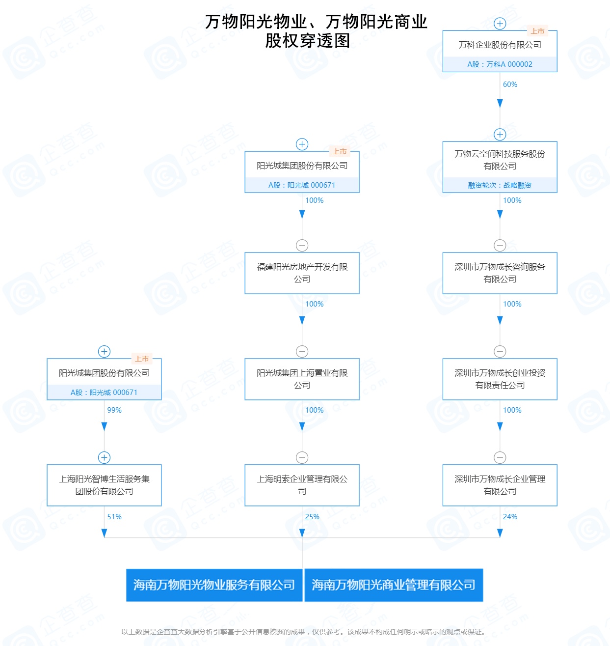 具体来看,万物阳光物业和万物阳光商业均由上海阳光智博生活服务集团股份有限公司(下称:阳光智博)持有51%股权,上海明索企业管理有限公司(下称:上海明索)持有25%股权,深圳市万物成长企业管理有限公司(下称:万物成长)持有24%股权。其中,阳光智博和上海明索企业管理有限公司为阳光城集团旗下企业,万物成长为万科A旗下企业。