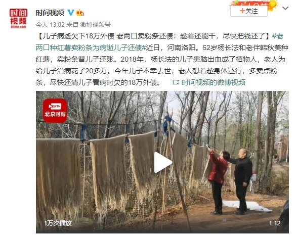 【儿子病逝欠下18万外债 老两口卖粉条还债:趁着还能干,尽快把钱还了】近日,河南洛阳。62岁杨长法和老伴韩秋美种红薯,卖粉条替儿子还账。2018年,杨长法的儿子患脑出血成了植物人,老人为给儿子治病花了20多万。今年儿子不幸去世,老人想着趁身体还行,多卖点粉条,尽快还清儿子看病时欠的18万外债。