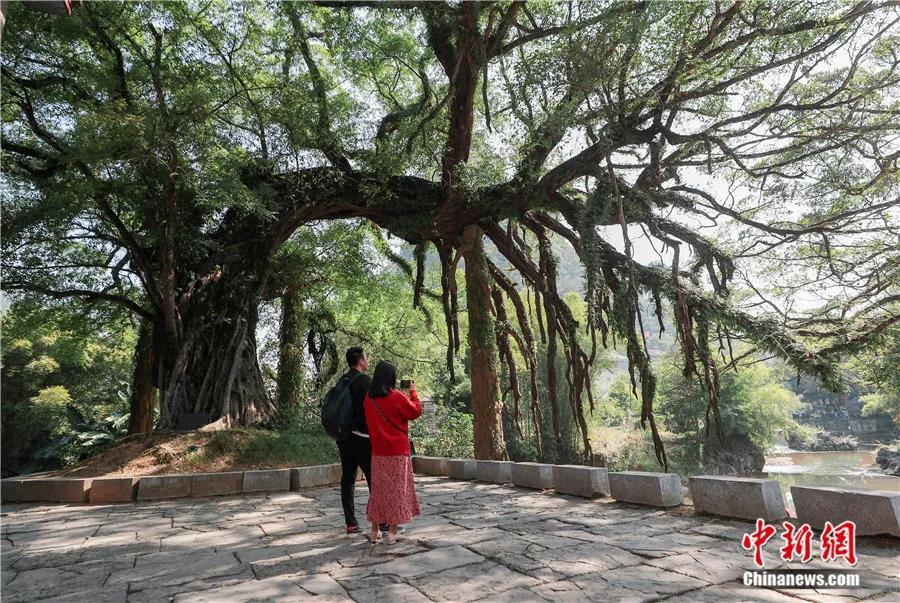 2020年10月,游客在广西昭平县的黄姚古镇内参观古榕树。中新社记者 贾天勇 摄