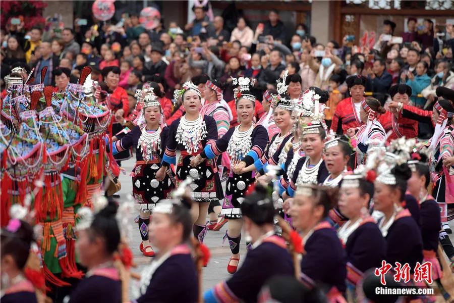 2021年11月19日,广西龙胜各族自治县各族民众身着节日盛装共跳团结舞庆祝自治县成立70周年。中新社记者 俞靖 摄
