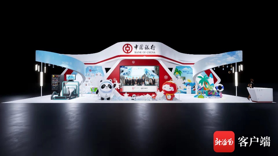在海南体博会2号展馆的中行展位,以空间艺术和科技运用为手段,以VR虚拟与现实展示为形式,全演绎“体育场景”与金融产品、冬奥冰雪与海南特色的交织。