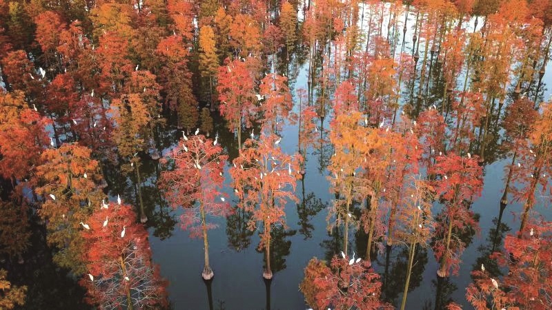 初冬暖阳晴空碧,武汉市新洲区涨渡湖湿地1万余棵池杉静立,红黄相间的树叶倒映在水中,形成一幅多彩油画,清风拂过,水面泛起涟漪,画卷层层推开。