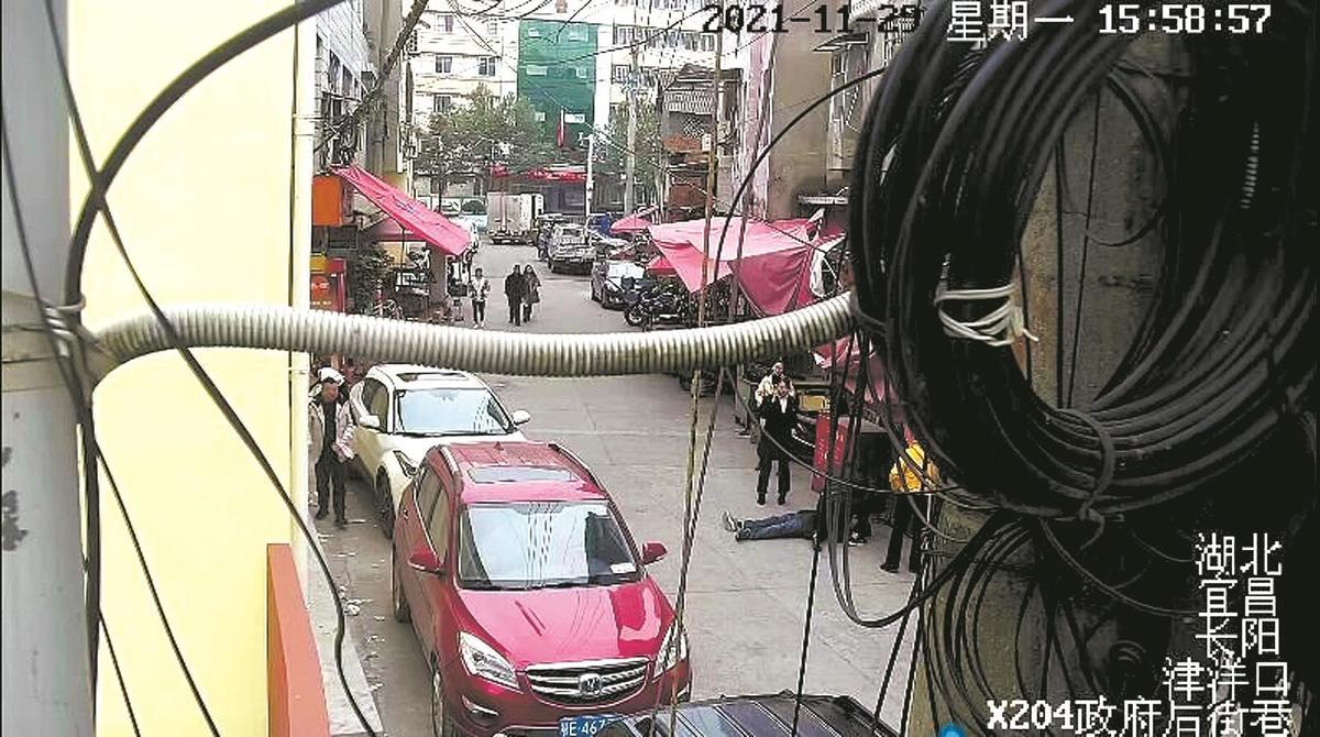 11月29日15时57分50秒,一名男性老者背着手走到后街二巷。突然,老人在原地转起了圈,脚步踉跄;李佳奕正从家对面的小卖部走出来,老人的异常吸引他扭头观察。