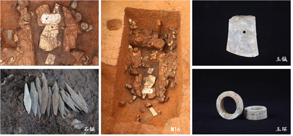 随葬陶器组合以鼎、盘、豆、壶、罐为主,磨制石器以镞、锛为主,玉器有琮、钺、环、玦、璧、锛、锥形器及圭形器等,以玉钺为最大宗。墓葬形制、丧葬礼俗及随葬器物组合都具有显著的石峡文化特征。墓葬也表现出明显的等级分化,高等级墓葬普遍随葬玉器,有的随葬品超过140件,包括5件玉钺与2件玉环,有的同时随葬有玉琮与玉钺。“这也是继石峡遗址后广东省发现的又一处新石器时代晚期高等级墓地。”刘锁强说。