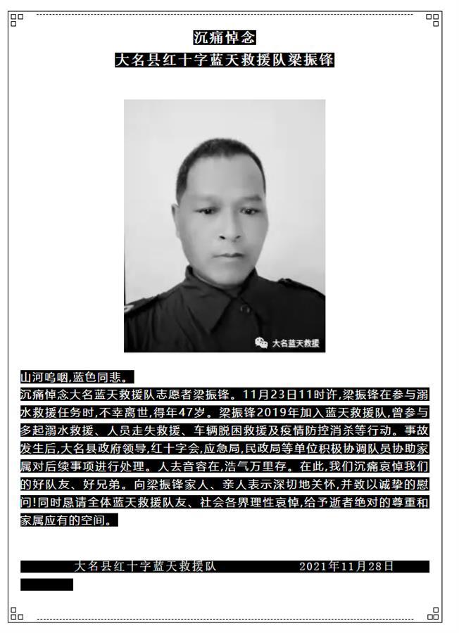此前,12月23日,大名蓝天救援队在漳河大名段执行义务搜救打捞任务时,救生艇马达被河中不明异物缠绕失去动力,发生侧翻,导致艇上5名救援队员跌入水中。其中一名救援队员梁振锋被湍急的水流冲走失联,两天后在落水点下游400米处发现,已经不幸遇难。