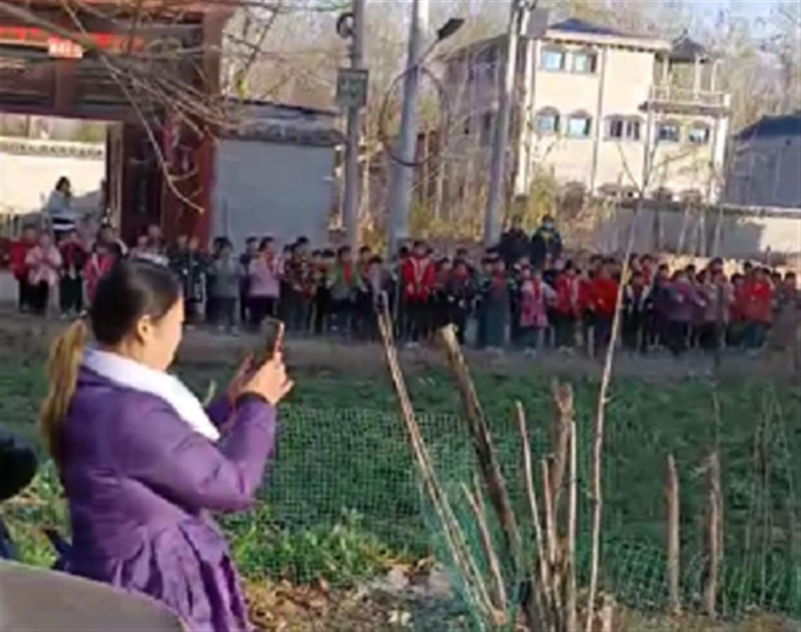 视频显示,200多名小学生在校长的带领下,围着菜园沿路站立,合唱《我要说谢谢你》,并伴随手势。在学生们的身后,有一红色条幅写着“衷心感谢爱心人士张鹏飞先生为张堂小学捐赠200套新桌椅”字样。周围不少村民观看拍照。