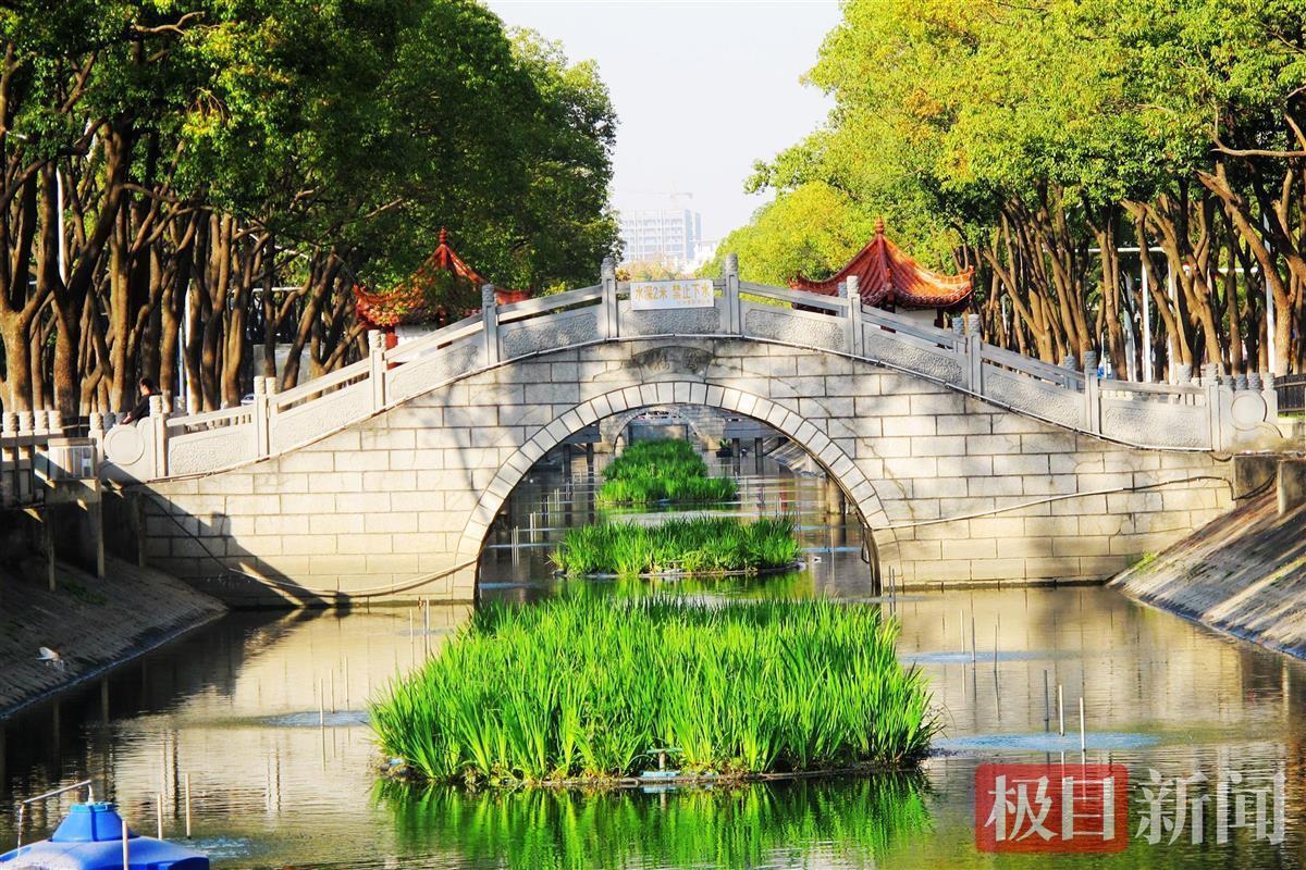 12月2日,武汉市东西湖区五环公园旁长长的水渠内,一块块水源生物净化模块与净化科技设备交互作用,使水渠成为一道靓丽的景观。