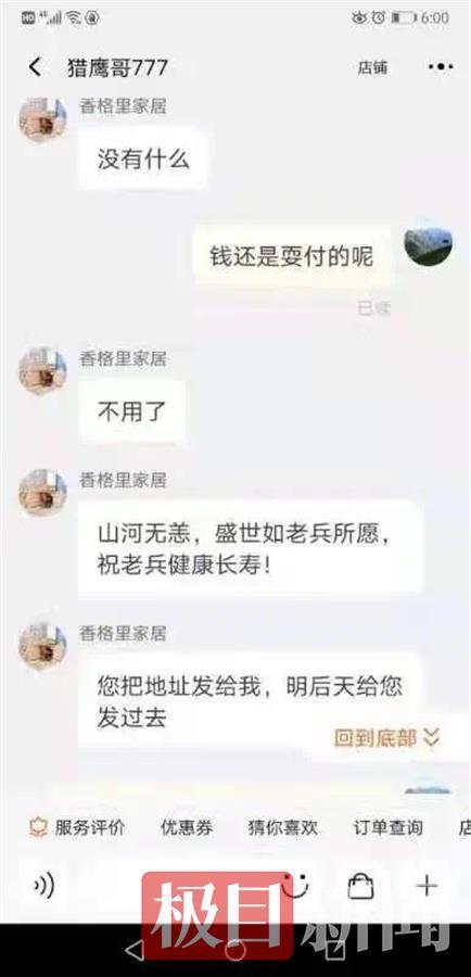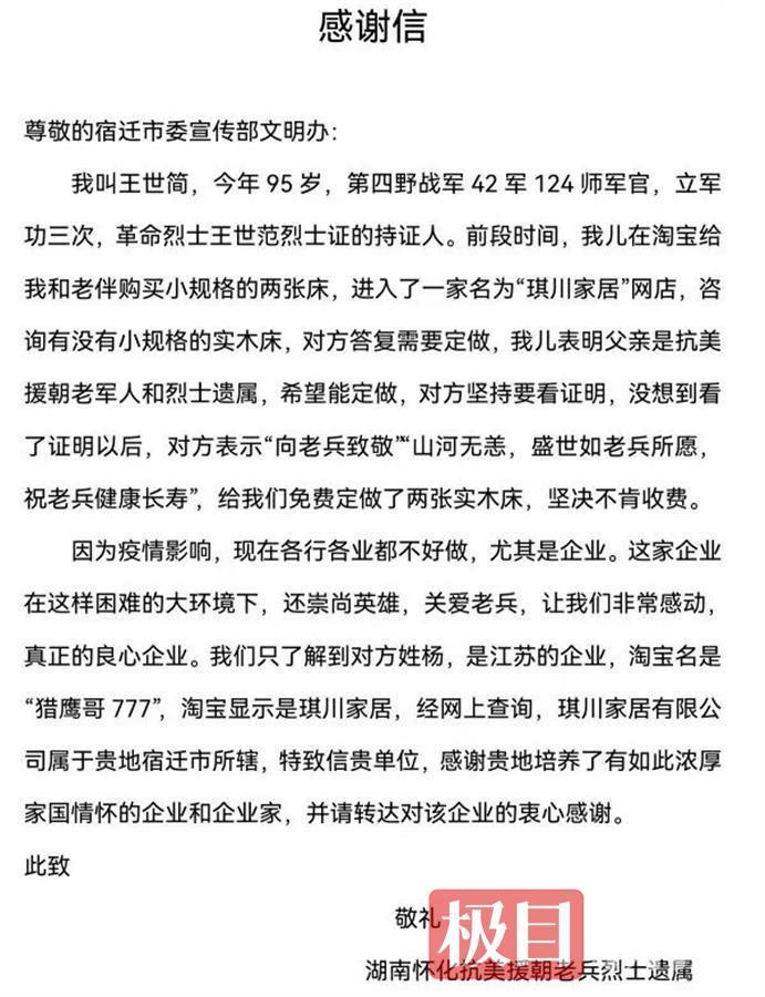 11月,王先生想为父母网购合适的新床,店主得知其95岁的父亲是参加过抗美援朝的老战士,大伯还牺牲在了战场上,当即表示,要免费为其父母定制两张床。