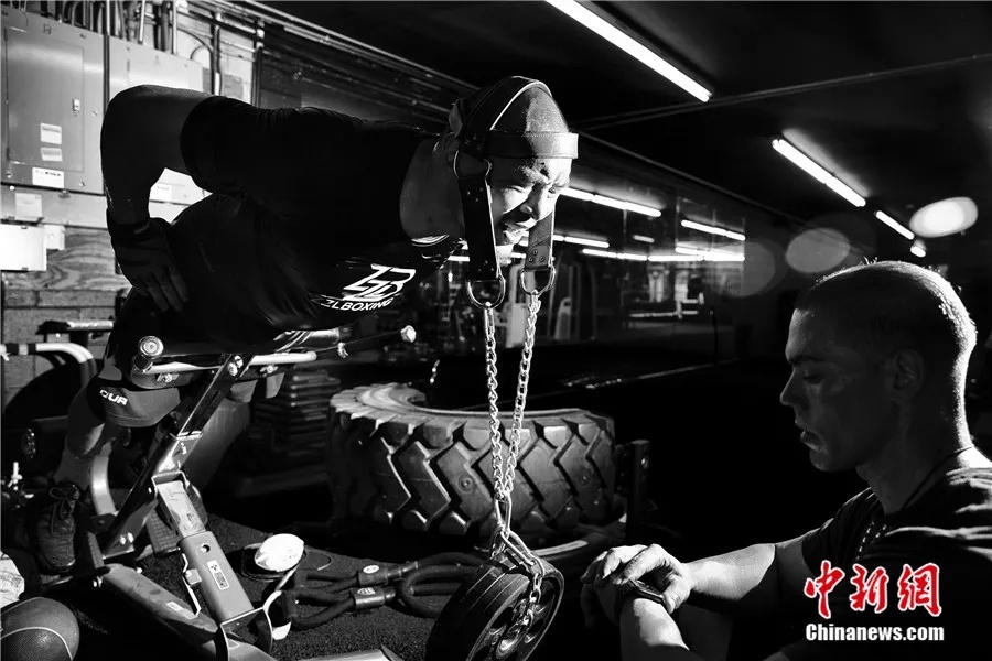 2021年,张志磊在美国新泽西州一家健身器材店训练馆进行体能训练,他的体能教练也是这间健身器材店的老板。许多职业拳手在这里训练,多数拳手除了训练还要上班。中新社记者 廖攀 摄